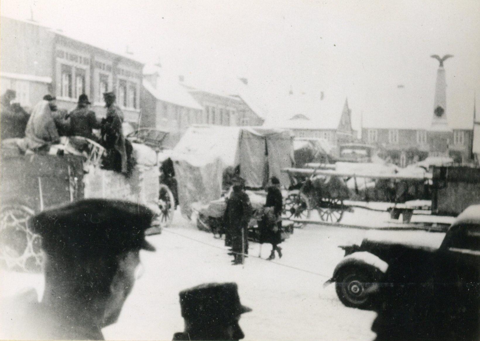 access - no reuse ↗ Trucks with refugees at the market square in Reetz on February 4, 1945, Photo by Werner Carow. |