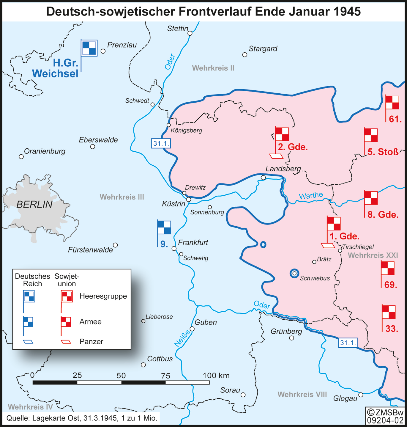 Frontverlauf Ende Januar 1945. Zentrum für Sozialwissenschaften und Militärgeschichte der Bundeswehr, Rechte vorbehalten – freier Zugang ↗ |