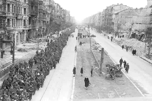 苏军攻克柏林之后,押着德军战俘从街道上走过。