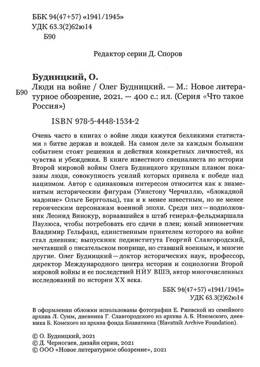 Книга: "Люди на войне" Автор: Олег Будницкий Издательство: Новое литературное обозрение Объем: 400 стр. 54 илл. Бумажная версия: 787 ₽ ISBN: 978-5-4448-1534-2 Масса: 486 г Размеры: 205x140x23 мм Тираж: 1500 экз. Год издания: 2021 Язык: русский Издание: Твердый переплёт Серия: Что такое Россия |