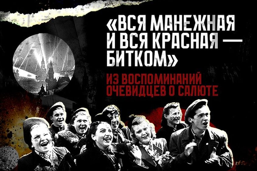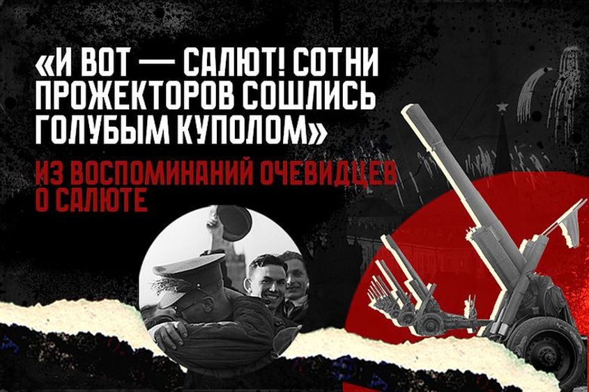 И вот — салют! Сотни прожекторов сошлись голубым куполом. В последний раз поднялись над Москвой аэростаты воздушного заграждения. Прожектора освещали огромный портрет Сталина, поднятый на тросе аэростата, и такой же громадный красный флаг. Ракеты, море огня. Чудесная феерия! Но залпы было слышно слабо — пушки стояли по окраинам. А потом по Садовому кольцу прошли «Дугласы» и кидали ракеты Обращение