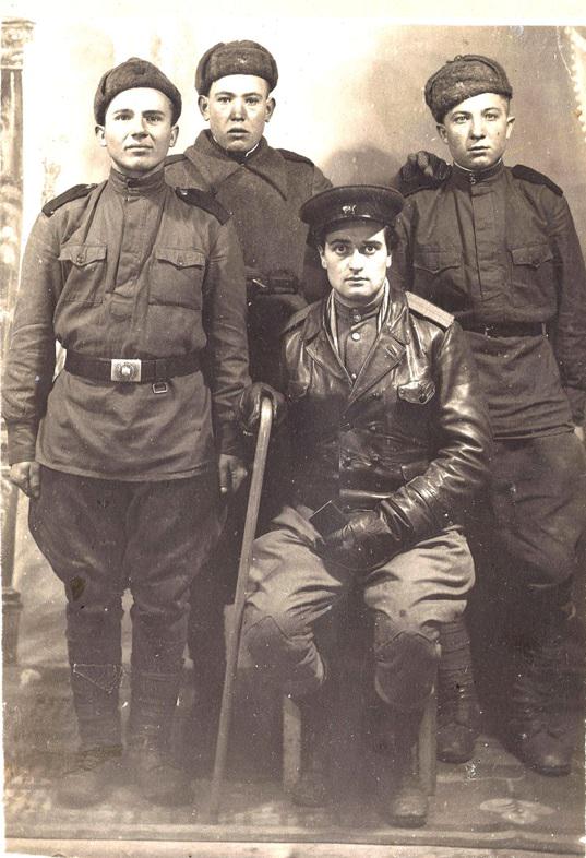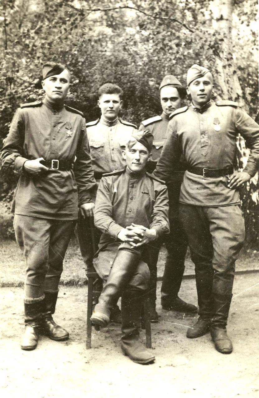 (二战)红军小队合影,前排坐椅者为军官弗拉基米尔·盖尔芬德。柏林,1945 年。家庭档案。
