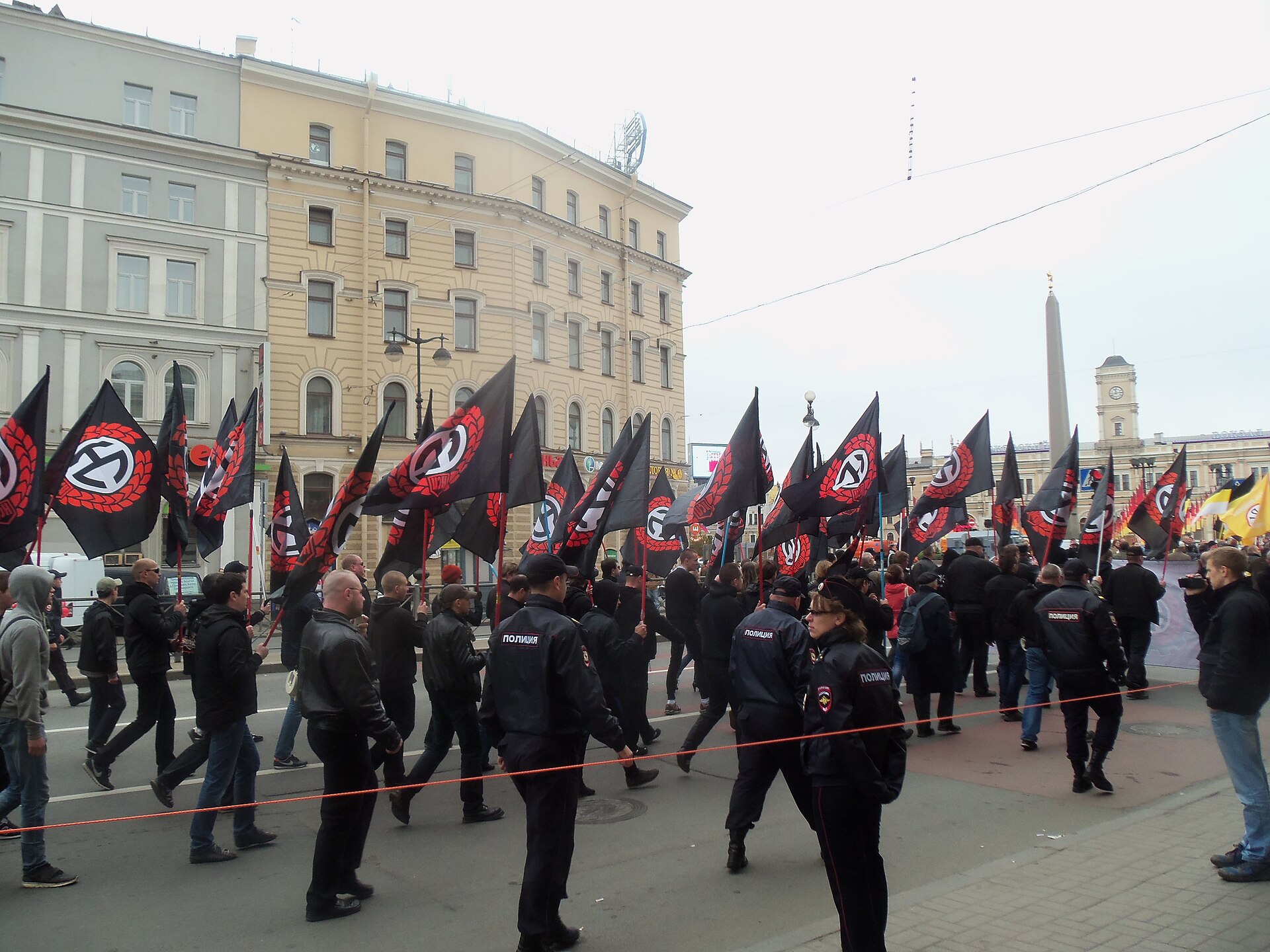(Gegenwart): Mitglieder der neonazistischen Organisation „Nationale Sozialistische Initiative“ bei der Maidemonstration in Sankt Petersburg, 2014. Quelle: Wikipedia. | ||