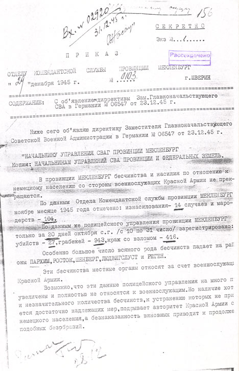 | …В лице советских солдат мы имеем дело со степными подонками. Это подтверждают поступившие к нам из восточных областей сведения о зверствах. Они действительно внушают ужас. Их невозможно даже воспроизвести в отдельности. Прежде всего, следует упомянуть об ужасных документах, поступивших из Верхней Силезии. В отдельных деревнях и городах бесчисленным изнасилованиям подверглись все женщины от 10 до 70 лет. Кажется, это делается по приказу сверху, так как в поведении советской солдатни можно усмотреть явную систему. |