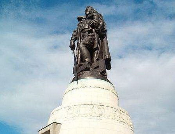На мемориале в Трептов-парке изображён советский солдат, стоящий на колонне: в одной руке он держит немецкую девочку, в другой — меч, а ногой попирает разбитую свастику. Высота статуи достигает 12 метров. Согласно легенде, именно в память о реальном случае и была создана эта скульптура: советский солдат, несмотря на град пуль, спас трёхлетнюю немецкую девочку в разрушенном Берлине. На памятнике выгравирована надпись о том, что Советская армия спасла европейскую цивилизацию от фашизма.