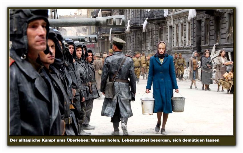 | [...] У немецких женщин не было шансов избежать всего этого, потому что в Берлине в апреле 1945 года, несмотря на бомбежки, именно они выходили из убежищ за едой, водой и другими вещами. Они даже готовили на дровяных печах на улице и ухаживали за больными мужчинами. Их готовили к изнасилованиям нацистов с помощью агитации и нагнетания страха. В «Боевом бюллетене обороны Берлина» говорилось: «'[...] Под дулами автоматов эти солдаты ходят из дома в дом, воруют часы и драгоценности, требуют шнапс и сигареты. Вечером внутриазиатские распутники обыскивают квартиры в поисках молодых немецких женщин и девушек, насилуя их с особой жестокостью». Подобные мужские диатрибы сеют страх и панику среди женщин, одновременно подстрекая мужчин против >злого Ивана<. Однако дело в том, что насиловали далеко не только русские. То же самое делали и «освободители», то есть американцы, англичане и французы. Но подстрекательство народа Геббельсом и другими продолжает сказываться и по сей день. Вряд ли кто-то вспоминает о массовых изнасилованиях во время Второй мировой войны с точки зрения американцев или даже о борделях вермахта у немцев и так называемых >Freudenabteilungen< нацистов, в которых еврейским женщинам, женщинам синти и другим пришлось пережить то, что несколько лет назад было сделано с женщинами в бывшей Югославии.» Моника Герстендерфер не оставляет сомнений в том, что мужчины, оставшиеся или вернувшиеся позже, сыграли менее славную роль: «Важно задать вопрос о том, как вели себя и вели ли себя немецкие мужчины, призванные защищать женщин. Правда такова: среди сотен тысяч, как говорят, было несколько человек, которые встали на защиту своих жен и даже положили за них жизнь. Большинство же спряталось за спины своих жен. Поэтому мужчины были невообразимо трусливы. Заявления типа «Они тебя не тронут, ты только молчи. Но они заберут нас в Сибирь» говорят сами за себя [...]. Ein weiterer, für Frauen und Mädchen tödlicher Faktor war und ist die so genannte männliche Ehre. Mehrere Männer schickten ihre Frauen und Töchter zur Todesstrafe und gaben ihnen Gift oder einen Strick. Es heißt, dass viele Frauen mehr unter den Anschuldigungen ihrer Männer litten als die meisten von ihnen, die sie meist nicht einmal kannten. Fazit: „Vergewaltigung ist eine Erscheinungsform des Krieges, keine Nebenwirkung.“ Und: „Die gesamtgesellschaftliche Reaktion auf sexuelle Gewalt gegen Frauen, auf Vergewaltigung, unterscheidet sich nicht so sehr von der des Krieges, wie es in der Welt der Fall ist.“ Traurige Statistik: „Die Zahl der Frauen und Mädchen, die in der sowjetischen Besatzungszone, in den ehemaligen DDR-Gebieten und auf der Flucht vergewaltigt wurden, wird auf 1,9 Millionen geschätzt.“ |