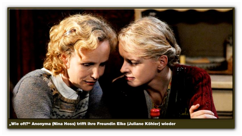 Es sind die letzten Tage des Krieges, April 1945 in Berlin. Im Keller eines halb zerstörten Wohnhauses kauern die Menschen und warten. Sie haben die Bombennächte überstanden und auch den Artilleriebeschuss. Die meisten von ihnen sind Frauen und sie ahnen, was sie erwartet. Der Einmarsch der Roten Armee in Berlin steht unmittelbar bevor. Da ist die stets hilfreiche Witwe (IRM HERMANN), da sind die lebenslustigen Schwestern Bärbel (JÖRDIS TRIEBEL) und Greta (ROSALIE THOMASS), die ältere Buchhändlerin (KATHARINA BLASCHKE), die Likör fabrikantin (MARIA HARTMANN), deren Mann sie einer Jüngeren wegen sitzen ließ, das lesbische Liebespaar Steffi (SANDRA HÜLLER) und Lisbeth (ISABELL GERSCHKE), die resolute Achtzigjährige (ERNI MANGOLD), das verzweifelte Flüchtlingsmädchen (ANNE KANIS), da sind Mütter mit ihren Kindern und auch ein paar ältere Männer, aus denen der Krieg alle Kraft herausgesogen hat. Vor allem aber ist da die knapp dreißigjährige Anonyma (NINA HOSS), dereinst Journalistin und Fotografin. Sie wird die Ereignisse der nächsten Tage für ihren Lebensgefährten Gerd (AUGUST DIEHL) festhalten, der vor Jahren an die Ostfront verschwand. Es werden Tage der Schrecken und widersprüchlichsten Erfahrungen. Anonyma wird, wie die meisten Frauen, von den Siegern mehrfach vergewaltigt. Doch sie taugt nicht zum Opfer. Mit Mut und dem unbedingtem Willen, ihre Würde zu verteidigen, fasst sie einen Entschluss. Sie wird sich „einen Wolf“ suchen, einen russischen Offizier, der sie vor den anderen schützt. Als Gegenleistung wird sie mit ihm schlafen – freiwillig. Und es geschieht, worauf sie am wenigsten gefasst war. Der höfliche, melancholische Offizier Andrej (EVGENY SIDIKHIN) weckt ihr Interesse. Es entsteht wirkliche Nähe. Und doch bleiben sie – er Sowjet, sie Deutsche – Feinde bis zum Ende. Auch die anderen Frauen entwickeln ihre Strategien, mal schnoddrig, mal unterwürfig, auf kleine Vorteile bedacht. Und es zeigt sich, dass auch die sowjetischen Soldaten nach menschlicher Nähe verlangen. Sie nisten sich ein in diesem zerbombten Haus. Und schließlich werden Sieger und Besiegte wie bei einem wilden Tanz auf dem Vulkan sogar das Ende des Krieges zusammen feiern. Denn etwas vereint sie doch: sie sind – nach einem langen Krieg – dem Tod entronnen. Nach dem Schrecken der männlichen Gewalt, nach einem Taumel der Gefühle wird sich der Blick auf eine Zukunft öffnen, in der sehr langsam ein normales Leben beginnen kann. (Quelle: Presseheft) DAS BUCH In drei dicht beschriebenen Schulheften hält Anonyma – damals eine noch relativ junge, aber schon weit gereiste Journalistin – ihre Erlebnisse in Berlin vom 20. April bis zum 22. Juni 1945 fest, als vergewaltigende und plündernde Rotarmisten durch die Stadt ziehen und auch sie ein Opfer wird. Aus den Kladden entstehen ab Juli 1945 auf grauem Kriegspapier 121 engzeilige Schreibmaschinenseiten. Erst Jahre später kommt das Typoskript unter anderem dem Schriftsteller Kurt W. Marek (C. W. Ceram) zu Gesicht, der schnell den historischen Wert dieses über das Persönliche hinausgehenden Zeitdokuments erkennt. Ceram entspricht dem Wunsch der Autorin, ihr Inkognito zu wahren und sorgt dafür, dass ein New Yorker Verleger im Herbst 1954 eine Übersetzung herausbringt. 1955 folgt eine britische Ausgabe. Seitdem sind Übersetzungen ins Schwedische, Norwegische und Holländische, ins Dänische und Italienische, ins Japanische und Spanische, ins Französische und Finnische erschienen. Eine Ausgabe des deutschen Originals wird 1959 von einem Schweizer Verleger herausgebracht – doch in der Bundesrepublik findet das Buch kaum Beachtung. Erst als Hans Magnus Enzensberger es 2003 in seine Reihe „Die andere Bibliothek“ beim Eichborn-Verlag aufnimmt, wird es – von der Kritik einhellig als großartiges Zeitzeugnis hoch gelobt – zu einem der meistgelesenen Bücher dieses Jahres. Enzensberger respektiert den Wunsch der (2001 verstorbenen) Autorin, auch nach ihrem Tod anonym zu bleiben. Doch Ende September enthüllt die Süddeutsche Zeitung die Identität von Anonyma. Iris Radisch konstatiert in Die Zeit vom 2.10.2003 einen Fall von „journalistischem Machismo“. Einen Tag zuvor kommt Joachim Güntner in einer der renommiertesten Zeitungen Europas, der Neuen Zürcher Zeitung, zu dem harschen Schluss: „Bisher fehlen die Belege, die eine seriöse journalistische Recherche von böser Nachrede unterscheiden würden.“ Im Januar 2004 spricht sich der Schriftsteller Walter Kempowski, ein anerkannter Experte in Sachen Tagebücher, für die Authentizität der Texte von Anonyma aus und sorgte somit für die Beendigung der leidigen Diskussion. |