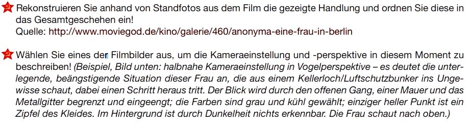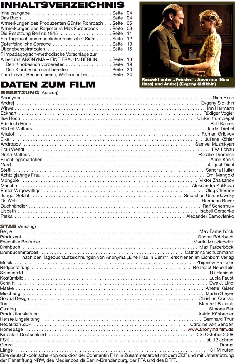„Wieder einmal muß ich darüber nachsinnen, was es bedeutet, in Furcht und Elend allein dazustehen. Es erscheint mir leichter, da die Qual des Mitleidens fehlt. Was mag die Mutter eines zerstörten Mädchens empfinden? Was jeder wirklich Liebende, der nicht helfen kann oder nicht zu helfen wagt?“ Über 60 Jahre ist es her, dass die Autorin und Journalistin unter ihrem Pseudonym Anonyma diese Sätze in ihr Tagebuch schreibt, das später auf den Bestseller-Listen zu finden sein wird. Anonyma beschreibt den Kampf ums Überleben und die Demütigung der Frauen durch Massen vergewalti gun - gen der Roten Armee in Berlin im Jahre 1945, ohne Gewalt und Vergewaltigung in den Vordergrund zu stellen. Ein Tabu bis heute. Der Film ANONYMA – EINE FRAU IN BERLIN bietet eine Chance, endlich dieses Tabu zu brechen und Bezüge zu heute herzustellen, denn noch immer werden tagtäglich Frauen in Kriegsgebieten vergewaltigt, gedemütigt und als „Kriegsbeute“ benutzt. Wir sind gefordert, auf Fragen, die sich stellen, Antworten zu geben. So, wie es dieser Film tut. Offen, ehrlich, schonungslos. Unsere Kinder verdienen es und all die Frauen, die bis heute nicht darüber sprechen konnten. Wir möchten Ihnen Mut machen, dieses immer noch bestehende Tabu in Ihrem Unterricht und Ihren Semina - ren anzusprechen. Die von uns zusammengestellten Materialien sollen Ihnen hierbei Unterstützung bieten. Ihre Vera Conrad mit den Autoren Regine Wenger und Rolf Thissen |