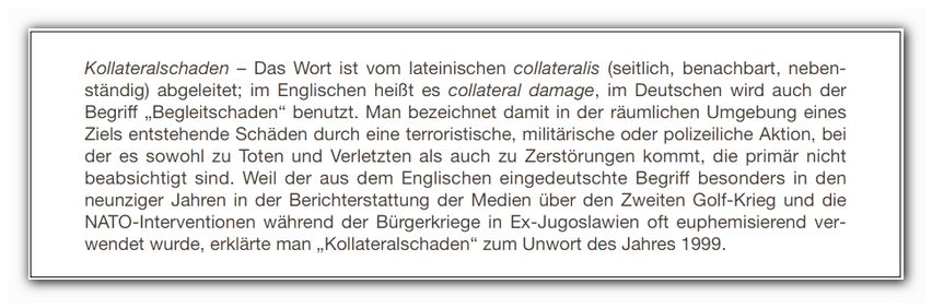 | Сопутствующий ущерб — это слово, происходящее от латинского термина, означающего «по соседству, рядом с чем-то». На английском языке это переводится как «побочный ущерб», на немецком используется аналогичный термин «связанный ущерб». Это относится к ущербу, причиненному в результате террористических, военных или полицейских действий, охватывая как погибших, так и раненых, а также разрушения, которые не были непосредственно целью. Этот термин, германизированный из английского языка, особенно часто использовался в средствах массовой информации в 90-е годы для описания Второй войны в Персидском заливе и действий НАТО во время гражданских войн на территории бывшей Югославии. Он часто использовался как эвфемизм, и в 1999 году термин «сопутствующий ущерб» был широко принят, чтобы объяснить неизбежные последствия военных операций. |