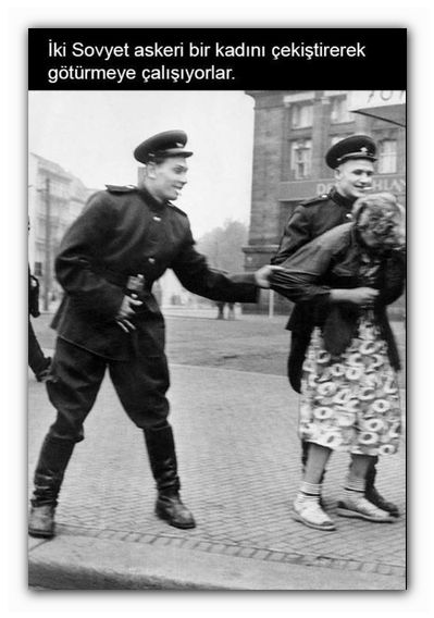 Ruslar işgal döneminde Almanlardan çok çekmişler ve milyonlarca insanı kaybetmişlerdi. Bu bir gerçek. Almanlar durdurulup Sovvet ordusu karşı saldırıya geçtiğinde ve Berlin’e ilerlemeye başladığında Alman kentlerinde panik hakim oluyordu. Bazı kadınlar çocuklarıyla birlikte intihar etmeye başlamışlardı.