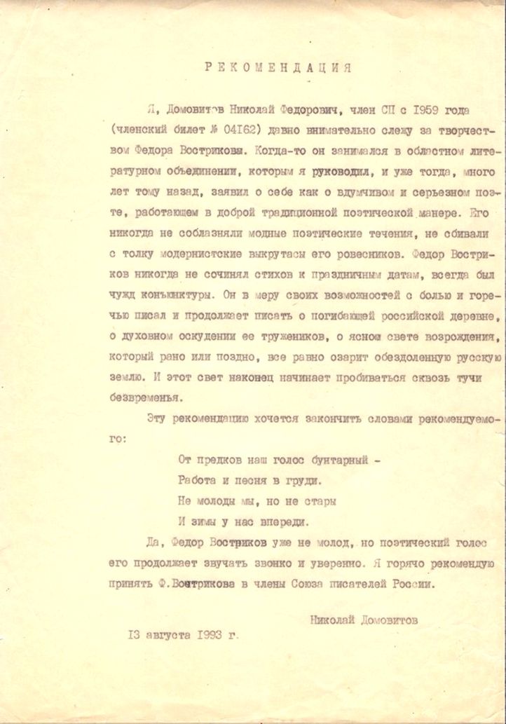 РЕКОМЕНДАЦИЯ Я, Домовитов Николай Федорович, член СП с 1959 года (членский билет №04162) давно внимательно слежу за творчеством Федора Вострикова. Когда-то он занимался в областном литературном объединении, которым я руководил, и уже тогда, много лет тому назад, заявил о себе как о вдумчивом и серьезном поэте, работающем в доброй традиционной поэтической манере. Его никогда не соблазняли модные поэтические течения, не сбивали с толку модернистские выкрутасы его ровесников. Федор Востриков никогда не сочинял стихов к праздничным датам, всегда был чужд конъюнктуры. Он в меру своих возможностей с болью и горечью писал и продолжает писать о погибающей российской деревне, о духовном оскудении ее тружеников, о ясном свете возрождения, который рано или поздно, все равно озарит обездоленную русскую землю. И этот свет наконец начинает пробиваться сквозь тучи безвременья. Эту рекомендацию хочется закончить словами рекомендуемого: От