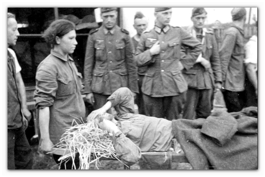 плену… Особенно цинично относилась к женщинам-военнопленным лагерная охрана из числа бывших военнопленных и лагерные полицаи. Они насиловали пленниц или под угрозой смерти заставляли сожительствовать с ними. В Шталаге № 337, неподалеку от Барановичей, на специально огороженной колючей проволокой территории содержалось около 400 женщин-военнопленных. В декабре 1967 г. на заседании военного трибунала Белорусского военного округа бывший начальник охраны лагеря А.М.Ярош признался, что его подчиненные насиловали узниц женского блока (П. Шерман. …И ужаснулась земля. (О зверствах немецких фашистах на территории города Барановичи и его окрестностях 27 июня 1941– 8 июля 1944). Факты, документы, свидетельства. Барановичи. 1990, с. 8– 9.) . В лагере военнопленных Миллерово тоже содержались пленные женщины. Комендантом женского барака была немка из немцев Поволжья. Страшной была участь девушек, томившихся в этом бараке: «Полицаи часто заглядывали в этот барак. Ежедневно за пол-литра комендант давала любую девушку на выбор на два часа. Полицай мог взять ее к себе в казарму. Они жили по двое в комнате. Эти два часа он мог ее использовать, как вещь, надругаться, поиздеваться, сделать все, что ему вздумается. Однажды во время вечерней поверки пришел сам шеф полиции, ему девушку давали на всю ночь, немка пожаловалась ему, что эти «падлюки» неохотно идут к твоим полицаям. Он с усмешкой посоветовал: «A ты тем, кто не хочет идти, устрой «красный пожарник». Девушку раздевали догола, распинали, привязав веревками на полу. Затем брали красный горький перец большого размера, выворачивали его и вставляли девушке во влагалище. Оставляли в таком положении до получаса. Кричать запрещали. У многих девушек губы были искусаны – сдерживали крик, и после такого наказания они долгое время не могли двигаться. Комендантша, за глаза ее называли людоедкой, пользовалась неограниченными правами над пленными девушками и придумывала и другие изощренные издевательства. Например, «самонаказание». Имеется специальный кол, который сделан крестообразно высотой 60 сантиметров. Девушка должна раздеться догола, вставить кол в задний проход, руками держаться за крестовину, а ноги положить на табуретку и так держаться три минуты. Кто не выдерживал, должен был повторить сначала. О том, что творится в женском лагере, мы узнавали от самих девушек, выходивших из барака посидеть минут десять на скамейке. Также и полицаи хвастливо рассказывали о своих подвигах и находчивой немке» (С. М. Фишер. Воспоминаний. Рукопись. Архив автора.) . Женщины-медики Красной армии, попавшие в плен, во многих лагерях военнопленных (в основном - в пересыльных и этапных) работали в лагерных лазаретах:![]() Здесь может быть и немецкий полевой госпиталь в прифронтовой полосе - на заднем плане видна часть кузова автомобиля, оборудованного для перевозки раненых, а у одного из немецких солдат на фото забинтована рука. Лазаретный барак лагеря для военнопленных в г.Красноармейск (вероятно, октябрь 1941 года):![]() На переднем плане - унтер-офицер германской полевой жандармерии с характерной бляхой на груди. Женщины-военнопленные содержались во многих лагерях. По словам очевидцев, они производили крайне жалкое впечатление. В условиях лагерной жизни им было особенно тяжело: они, как никто другой, страдали от отсутствия элементарных с