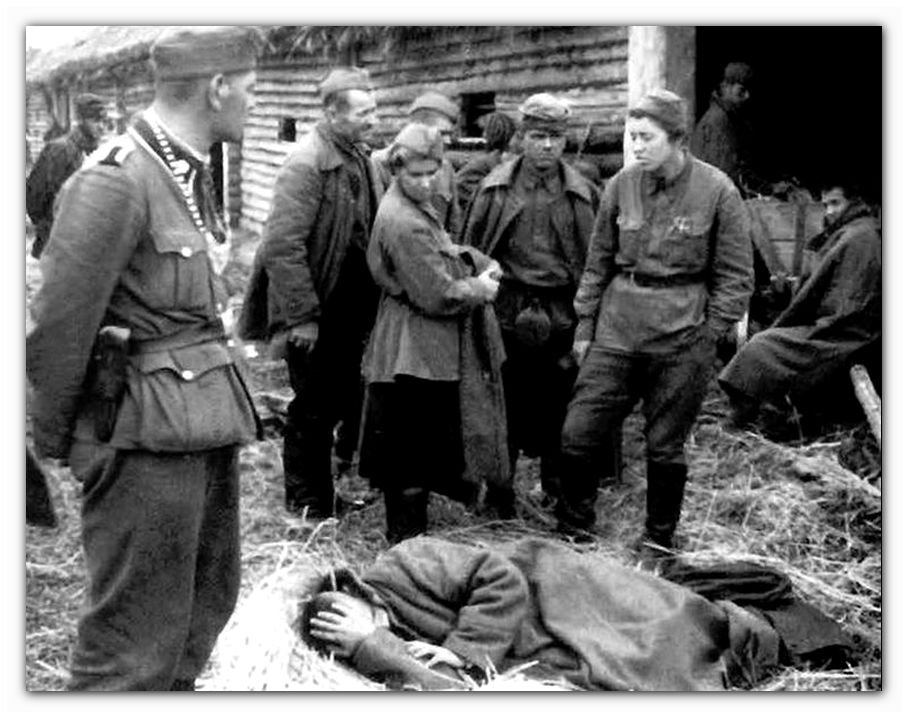 Переводчик дивизионной разведки П.Рафес вспоминает, что в освобожденной в 1943 г. деревне Смаглеевка в 10 км от Кантемировки жители рассказали, как в 1941 г. «раненую девушку-лейтенанта голую вытащили на дорогу, порезали лицо, руки, отрезали груди...» (П. Рафес. Тогда они еще не каялись. Из Записок переводчика дивизионной разведки. «Огонек». Спецвыпуск. М., 2000, №70.) Зная о том, что их ожидает в случае плена, женщины-солдаты, как правило, сражались до последнего. Часто захваченные в плен женщины перед смертью подвергались насилию. Солдат из 11-й танковой дивизии Ганс Рудгоф свидетельствует, что зимой 1942 г. «… на дорогах лежали русские санитарки. Их расстреляли и бросили на дорогу. Они лежали обнаженные… На этих мертвых телах… были написаны похабные надписи» (Архив Яд Вашем. М-33/1182, л. 94– 95.) . В Ростове в июле 1942 г. немецкие мотоциклисты ворвались во двор, в котором находились санитарки из госпиталя. Они собирались переодеться в гражданское платье, но не успели. Их так, в военной форме, затащили в сарай и изнасиловали. Однако не убили (Владислав Смирнов. Ростовский кошмар. – «Огонек». М., 1998. №6.) . Насилию и издевательствам подвергались и женщины-военнопленные, оказавшиеся в лагерях. Бывший военнопленный К.А.Шенипов рассказал, что в лагере в Дрогобыче была красивая пленная девушка по имени Люда. «Капитан Штроер – комендант лагеря, пытался ее изнасиловать, но она оказала сопротивление, после чего немецкие солдаты, вызванные капитаном, привязали Люду к койке, и в таком положении Штроер ее изнасиловал, а потом застрелил» (Архив Яд Вашем. М-33/1182, л. 11.) . В шталаге 346 в Кременчуге в начале 1942 г. немецкий лагерный врач Орлянд собрал 50 женщин врачей, фельдшериц, медсестер, раздел их и «приказал нашим врачам исследовать их со стороны гениталий - не больны ли они венерическими заболеваниями. Наружный осмотр он проводил сам. Выбрал из них 3 молодых девушек, забрал их к себе «прислуживать». За осмотренными врачами женщинами приходили немецкие солдаты и офицеры. Немногим из этих женщин удалось избежать изнасилования (Архив Яд Вашем. М-33/230, л. 38,53,94; М-37/1191, л. 26.) . Женщины-военнослужаще РККА, попавшие в плен при попытке выйти из окружения под Невелем, лето 1941 года: