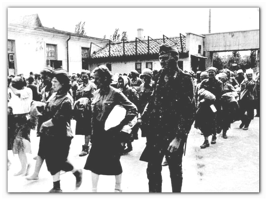 уже лужи крови, а шеренгам, гоготу и мату нет конца. Гордо подбоченясь, командует майор А. Но вот поднимается последний, и на два полутрупа набрасываются палачи-сержанты. Майор А. вытаскивает из кобуры наган и стреляет в окровавленные рты мучениц, и сержанты тащат их изуродованные тела в свинарник, и голодные свиньи начинают отрывать у них уши, носы, груди, и через несколько минут от них остаются только два черепа, кости, позвонки. Мне страшно, отвратительно. Внезапно к горлу подкатывает тошнота, и меня выворачивает наизнанку. Майор А. - боже, какой подлец! Я не могу работать, выбегаю из дома, не разбирая дороги, иду куда-то, возвращаюсь, я не могу, я должен заглянуть в свинарник. Передо мной налитые кровью свиные глаза, а среди соломы, свиного помета два черепа, челюсть, несколько позвонков и костей и два золотых крестика - две «спасенные» мной девочки. Комендант города, старший по званию полковник, пытался организовать круговую оборону, но полупьяные бойцы вытаскивали из квартир женщин и девочек. В критическом положении комендант принимает решение опередить потерявших контроль над собой солдат. По его поручению офицер связи передает мне приказ выставить вокруг костела боевое охранение из восьми моих автоматчиков, а специально созданная команда отбивает у потерявших контроль над собой воинов-победителей захваченных ими женщин. Другая команда возвращает в части разбежавшихся по городу в поисках «удовольствий» солдат и офицеров, объясняет им, что город и район окружены. С трудом создает круговую оборону. В это время в костел загоняют около двухсотпятидесяти женщин и девочек, но уже минут через сорок к костелу подъезжают несколько танков. Танкисты отжимают, оттесняют от входа моих автоматчиков, врываются в храм, сбивают с ног и начинают насиловать женщин. Я ничего не могу сделать. Молодая немка ищет у меня защиты, другая опускается на колени. Герр лейтенант, герр лейтенант! Надеясь на что-то, окружили меня. Все что-то говорят. А уже весть проносится по городу, и уже выстроилась очередь, и опять этот проклятый гогот, и очередь, и мои солдаты. Назад, е… вашу мать! - ору я и не знаю, куда девать себя и как защитить валяющихся около моих ног, а трагедия стремительно разрастается. Стоны умирающих женщин. И вот уже по лестнице (зачем? почему?) тащат наверх, на площадку окровавленных, полуобнаженных, потерявших сознание и через выбитые окна сбрасывают на каменные плиты мостовой. Хватают, раздевают, убивают. Вокруг меня никого не остается. Такого еще ни я, никто из моих солдат не видел. Странный час. Танкисты уехали. Тишина. Ночь. Жуткая гора трупов. Не в силах оставаться, мы покидаем костел. И спать мы тоже не можем. Вот и ответил советский ветеран Леонид Николаевич Рабичев вроде бы писательнице Татьяне Толстой. Немки, конечно же, рожали - но лишь те, кого не убили. А мертвые, Таня, не рожают. Женщины-медработники РККА, взятые в плен под Киевом, собраны для этапирования в лагерь военнопленных, август 1941 года: Форма одежды многих девушек - полувоенная-полугражданская, что характерно для начального этапа войны, когда в Красной армии были сложности с обеспечением женскими комплектами обмундирования и форменной обувью маленьких размеров. Слева - унылый пленный лейтенант-артиллерист, может быть, «командир этапа». Сколько женщин-военнослужащих Красной Армии о