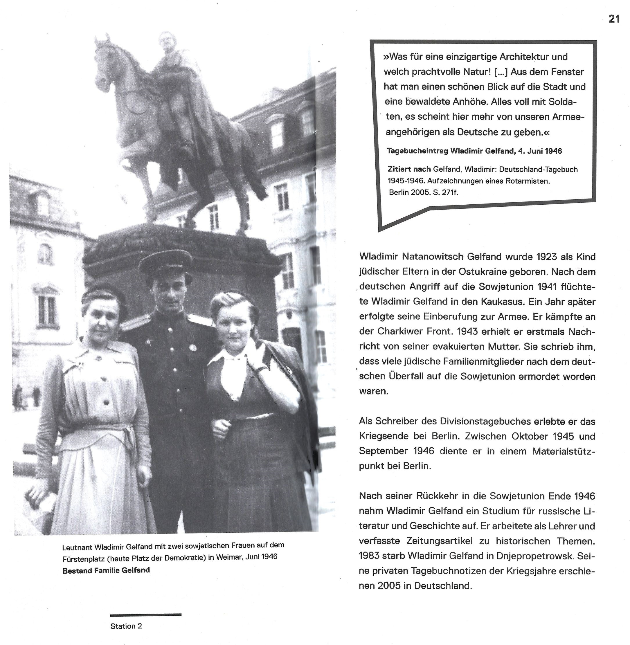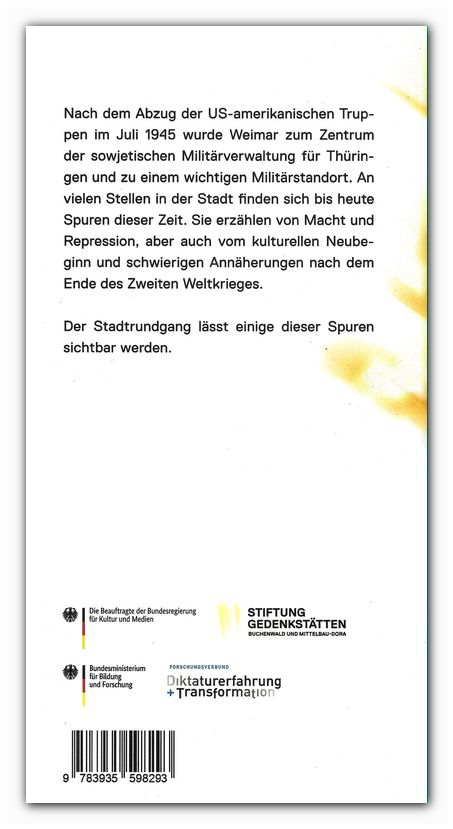 | Nach dem Abzug der US amerikanischen Truppen im Juli 1945 wurde Weimar zum Zentrum der sowjetischen Militärverwaltung für Thüringen und zu einem wichtigen Militärstandort An vielen Stellen in der Stadt finden sich bis heute Spuren dieser Zeit Sie erzählen von Macht und Repression, aber auch vom kulturellen Neubeginn und schwierigen Annäherungen nach dem Ende des Zweiten Weltkrieges. Der Stadtrundgang lässt einige dieser Spuren sichtbar werden. | ||
