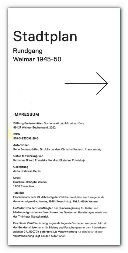 02.11.2022 опубликовано новое издание фонда Какое отношение подвал на Фалькштрассе имеет к советским спецслужбам? Где находился «Пушкинский дом»? Ответы на эти и другие вопросы даны в новой брошюре Мемориала Бухенвальда, где представлена информация о следах советской оккупации в Веймаре с 1945 по 1950 годы. Почти 60-страничный буклет появился в результате экскурсии по городу, которую издала команда подпроекта «Память без знаний?» и хранителя истории советского спецлагеря № 1. Авторы выбрали девять мест в районе города, которые связаны с военной и гражданской администрацией, а также с отдельными рассказами немецких и советских очевидцев. Речь идет о власти и репрессиях, а также о сложных культурных подходах и личных встречах после Второй мировой войны. Отправляйтесь на поиски улик. Вы можете отправить нам сообщение на kustodie2@buchenwald.de о дополнениях и других местах. Брошюру можно приобрести в интернет-магазине или в книжном магазине Мемориала Бухенвальда по цене 3,90 евро.