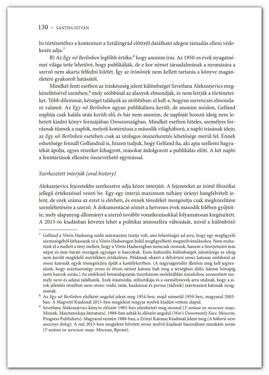 | Алексеевич публикует свои интервью, разбитые на главы. Каждую главу она предваряет философским трактатом. Каждое интервью основано на нескольких часах аудиозаписей, однако их общее количество может достигать тысячи, и часть этого объёма автор использует лишь для иллюстрации своего подхода. Основная часть документации была собрана во второй половине 1970-х годов и постоянно дополнялась дополнительными сведениями. В издании 2015 года можно проследить изменение политической атмосферы, поскольку Гельфанд, будучи офицером Красной Армии еврейского происхождения, позволяет увидеть проявления внутри Красной Армии с точки зрения наблюдателя. ⁷ Гельфанд был офицером Красной армии еврейского происхождения, что даёт возможность рассмотреть проявления внутри Красной армии с точки зрения наблюдателя. Нельзя упускать из виду, что в Красной армии сражались не только русские, но и представители других народов Советского Союза и дружественных стран. Значение этих культурных различий до сих пор не получило должной оценки. Например, российский военный памятник в Дельвертеше возведён на месте массовой могилы русских солдат в парке замка. (Стоит отметить масштаб: 114 русских и 50 немецких солдат погибли в трёхмесячных боях в регионе.) На бетонном основании памятника установлены тринадцать мемориальных табличек с именами и данными девятнадцати идентифицированных человек. Стиль написания и имена свидетельствуют, что многие из похороненных не были русскими, а имели еврейское, татарское, кавказское и персидское (таджикское) происхождение. ⁸ Книга «Женщина в Берлине» впервые вышла на английском в 1954 году, затем на немецком в 1959, а на венгерском — в 2003 году. За основу взято венгерское издание 2015 года, опубликованное в издательстве Magvető. ⁹ Книга Светланы Алексиевич впервые была опубликована на русском в 1985 году («У войны не женское лицо». Минск, Мастацкая литература). Английский перевод вышел в 1988 году (War’s Unwomanly Face. Moscow, Progress Publishers). На венгерском языке книга вышла также в 1988 году в издательстве Zrínyi Katonai Kiadó («A háború nem asszonyi dolog»). В работе использовалось расширенное русское издание 2015 года (У войны не женское лицо. Москва, Время). Мы не можем игнорировать тот факт, что в составе Красной Армии воевали не только русские, но и представители других народов Советского Союза и дружественных стран. Важность этих культурных различий до сих пор недостаточно оценена. Например, русский военный памятник в Дель-Верте был построен на одной из братских могил русских солдат в саду замка. (Что касается масштабов боёв, стоит отметить, что за трёхмесячные сражения в этом районе погибли 114 русских и 50 немецких солдат.) На тринадцати мемориальных досках, размещённых на бетонном постаменте мемориала, записаны имена и данные девятнадцати опознанных погибших. Их написание, стилистика и личные имена свидетельствуют о том, что в значительном числе могил похоронены воины нерусского происхождения: еврейского, татарского, кавказского и персидского (таджикского) этносов. Алексеевич не объединяла показания разных лет и не редактировала интервью, проведённые в разные периоды. По совпадению, документация 1985 года и последующие тексты — размышления об обстоятельствах оригинального издания — рассматриваются отдельно и иллюстрируются отрывками из интервью. Это создаёт возмож