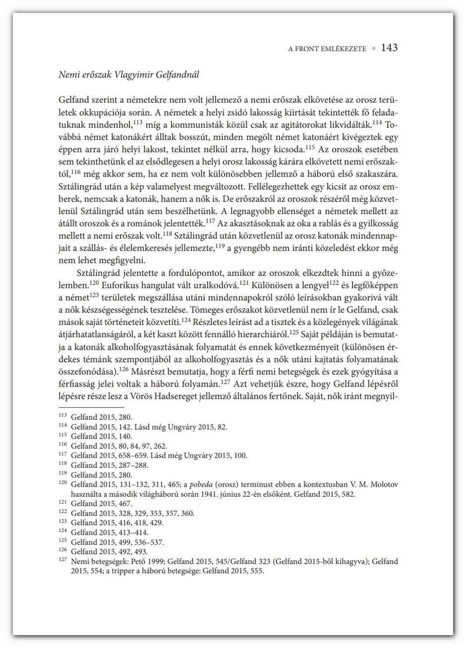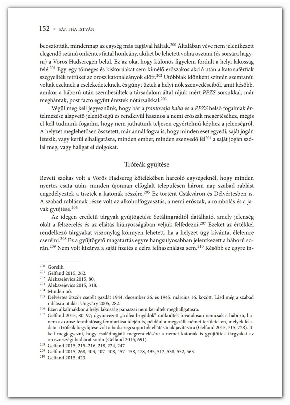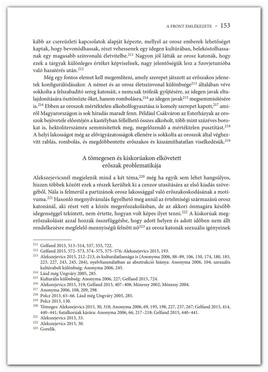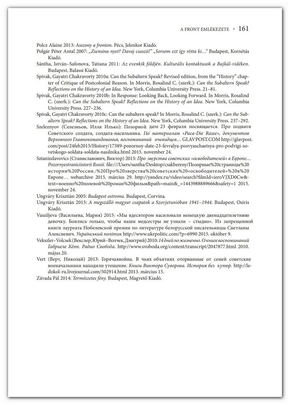 Литература и источники • Gelfand, Vlagyimir (Гельфанд, Владимир) 2015: Дневник 1941–1946. Москва, Росспэн.• Gelfand, Vlagyimir (Гельфанд, Владимир): Дневники 1941–1946 годов. URL: http://royallib.com/gelfand, дата обращения: 24 ноября 2015. • Gorelik (Горелик, Петр): Трофейные женщины. Ogonek. URL: http://трофейные_женщины, дата обращения: 24 ноября 2015. • Haraway, Donna 2004: Situated knowledges. The science question in feminism and the privilege of partial perspective. In Harding, Sandra G. (ed.): The Feminist Standpoint Theory Reader. Intellectual and Political Controversies. New York–London, Routledge, pp. 81–102. • Harding, Sandra G. 2004: Introduction: Standpoint Theory as a Site of Political, Philosophic and Scientific Debate. In Harding, Sandra G. (ed.): The Feminist Standpoint Theory Reader. Intellectual and Political Controversies. New York–London, Routledge. • Harris, Mark 1996: Accounting for War. Soviet Production, Employment, and the Defence Burden, 1940–1945. Cambridge, Cambridge University Press. • Kobyljanszkij (Кобылянский, Исаак Григорьевич): О ППЖ и боевых подругах. In Прямой наводкой по врагу. URL: http://www.e-reading, дата обращения: 24 ноября 2015. • Li, Laura (Ли, Лаура): ППЖ: наложницы или боевые подруги? Женское лицо войны. URL: http://shkolaz, дата обращения: 24 ноября 2015. • MacKinnon, Catharine A. 2004: Feminism, Marxism, Method, and the State. Toward Feminist Jurisprudence. In Harding, Sandra G. (ed.): The Feminist Standpoint Theory Reader. Intellectual and Political Controversies. New York–London, Routledge, pp. 169–180. • Merán Fülöp 2002: Vadászemlékek, gondolatok. Budapest, Nimród Alapítvány. • Merán Fülöp 2006: A nagyszakállú Péter bácsi. In Az emlékek nem hazudnak. Budapest, Nimród Vadászújság. • Mózessy Gergely (ed.) 2002: Shvoy Lajos: Önéletrajz. Székesfehérvár, Székesfehérvári Püspöki és Székeskáptalani Levéltár. (Források a Székesfehérvári Egyházmegye történetéből, 1). • Mózessy Gergely (ed.) 2004: Inter Arma 1944–1945. Fegyverek közt. Válogatás a második világháború egyházmegyei történetének forrásaiból. Székesfehérvár, Székesfehérvári Püspöki és Székeskáptalani Levéltár. • Nora, Pierre 2010: Emlékezet és történelem között. Budapest, Napvilág Kiadó. • Pető Andrea 1999: Átvonuló hadsereg, maradandó. Дата обращения: 24 ноября 2015. • Pető, Andrea 2003: Memory and the Narrative of Rape in Budapest and Vienna. In Dirk Schumann–Richard Bessel (eds.): Life after Death. Approaches to a Cultural and Social History of Europe during the 1940s and 1950s. Cambridge, Cambridge University Press, pp. 129–149. • Pető, Andrea 2014a: Przemilczane gwałty. Pamiec, 2014/11, pp. 33–38. • Pető Andrea 2014b: Az elmondhatatlan emlékezet. A szovjet katonák által elkövetett nemi erőszak Magyarországon. Rubicon, 2014/2, pp. 44–49. • Pető Andrea 2015a: A II. világháborús nemi erőszak történetírása Magyarországon. URL: http://mandiner, дата публикации: 31 марта 2015. • Pető Andrea 2015b: Szovjet katonák és nemi erőszak – az orosz internetes források tükrében. mandiner, 2015 (11), p. 7. • Polcz, Alaine (Польц, Алэн) 2004: Женщина и война. Предисловие А. Мелихова. Перевод с венгерского Е. Шакировой. Журнал «Нева», №2, 2004. Военная литература. URL: http://militera.lib.ru, дата обращения: 24 ноября 2015. • Polcz Alaine 2006: Asszony a fronton. Egy fejezet életemből. Hangoskönyv. A szerző előadásában. Pécs, Alexandra Kiadó. • Polcz Alaine 2013: Asszony a fronton. Pécs, Jelenkor Kiadó. • Polgár Péter Antal 2007: „Zsensina nyet? Davaj csaszü!” „Sorsom ezt így rótta ki…” Budapest, Kornétás Kiadó. • Sántha, István–Safonova, Tatiana 2011: Az evenkik földjén. Kulturális kontaktusok a Bajkál-vidéken. Budapest, Balassi Kiadó. • Spivak, Gayatri Chakravorty 2010a: Can the Subaltern Speak? Revised edition, from the “History” chapter of Critique of Postcolonial Reason. In Morris, Rosalind C. (ed.): Can the Subaltern Speak? Reflections on the History of an Idea. New York, Columbia University Press, pp. 21–81. • Spivak, Gayatri Chakravorty 2010b: In Response: Looking Back, Looking Forward. In Morris, Rosalind C. (ed.): Can the Subaltern Speak? Reflections on the History of an Idea. New York, Columbia University Press, pp. 227–236. • Spivak, Gayatri Chakravorty 2010c: Can the subaltern speak? In Morris, Rosalind C. (ed.): Can the Subaltern Speak? Reflections on the History of an Idea. New York, Columbia University Press, pp. 237–292. • Szeleznyov (Селезньов, Илля Илько): Позорной дате 23 февраля посвящается. Про подвиги Советского солдата, солдата-насильника. По материалам «Раса-Die Rasse», документов Верховного Главнокомандования, воспоминаний очевидцев. URL: http://glavpost.com, дата обращения: 24 ноября 2015. • Sztaniszlavovics (Станиславович, Виктор) 2015: Про зверства советских «освободителей» в Европе… Pozornyestraniciistorii Rossii. 29 марта 2015. URL: http://yandex.ru, дата обращения: 24 ноября 2015. • Ungváry Krisztián 2005: Budapest ostroma. Budapest, Corvina. • Ungváry Krisztán 2015: A meg