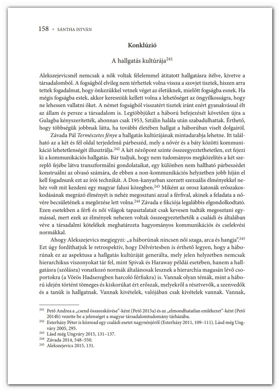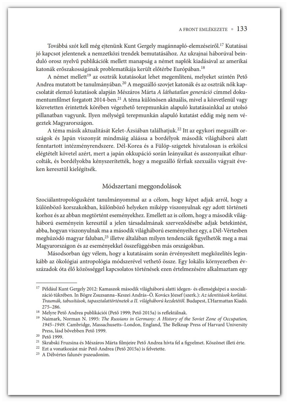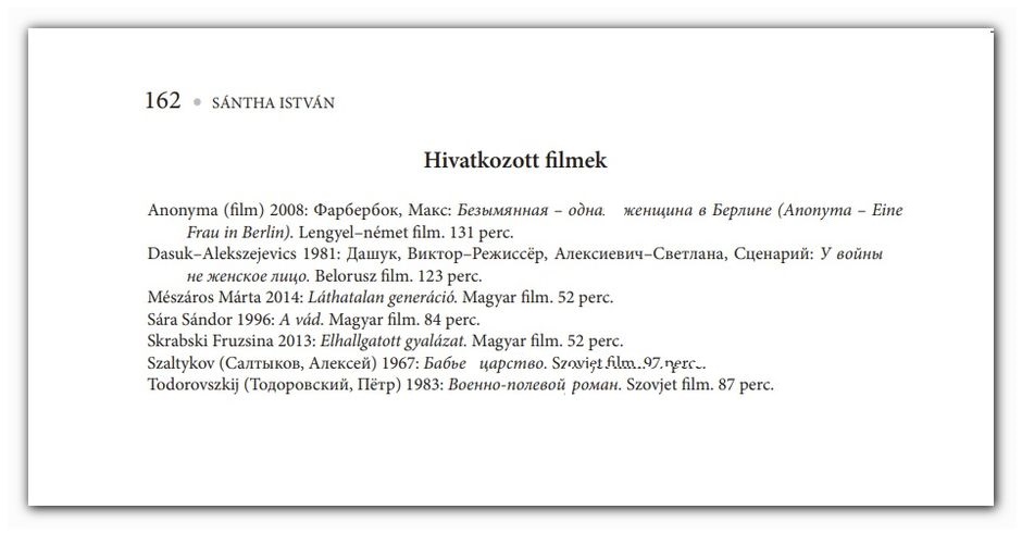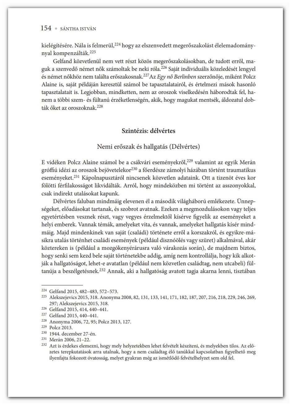 Литература и источники • Gelfand, Vlagyimir (Гельфанд, Владимир) 2015: Дневник 1941–1946. Москва, Росспэн.• Gelfand, Vlagyimir (Гельфанд, Владимир): Дневники 1941–1946 годов. URL: http://royallib.com/gelfand, дата обращения: 24 ноября 2015. • Gorelik (Горелик, Петр): Трофейные женщины. Ogonek. URL: http://трофейные_женщины, дата обращения: 24 ноября 2015. • Haraway, Donna 2004: Situated knowledges. The science question in feminism and the privilege of partial perspective. In Harding, Sandra G. (ed.): The Feminist Standpoint Theory Reader. Intellectual and Political Controversies. New York–London, Routledge, pp. 81–102. • Harding, Sandra G. 2004: Introduction: Standpoint Theory as a Site of Political, Philosophic and Scientific Debate. In Harding, Sandra G. (ed.): The Feminist Standpoint Theory Reader. Intellectual and Political Controversies. New York–London, Routledge. • Harris, Mark 1996: Accounting for War. Soviet Production, Employment, and the Defence Burden, 1940–1945. Cambridge, Cambridge University Press. • Kobyljanszkij (Кобылянский, Исаак Григорьевич): О ППЖ и боевых подругах. In Прямой наводкой по врагу. URL: http://www.e-reading, дата обращения: 24 ноября 2015. • Li, Laura (Ли, Лаура): ППЖ: наложницы или боевые подруги? Женское лицо войны. URL: http://shkolaz, дата обращения: 24 ноября 2015. • MacKinnon, Catharine A. 2004: Feminism, Marxism, Method, and the State. Toward Feminist Jurisprudence. In Harding, Sandra G. (ed.): The Feminist Standpoint Theory Reader. Intellectual and Political Controversies. New York–London, Routledge, pp. 169–180. • Merán Fülöp 2002: Vadászemlékek, gondolatok. Budapest, Nimród Alapítvány. • Merán Fülöp 2006: A nagyszakállú Péter bácsi. In Az emlékek nem hazudnak. Budapest, Nimród Vadászújság. • Mózessy Gergely (ed.) 2002: Shvoy Lajos: Önéletrajz. Székesfehérvár, Székesfehérvári Püspöki és Székeskáptalani Levéltár. (Források a Székesfehérvári Egyházmegye történetéből, 1). • Mózessy Gergely (ed.) 2004: Inter Arma 1944–1945. Fegyverek közt. Válogatás a második világháború egyházmegyei történetének forrásaiból. Székesfehérvár, Székesfehérvári Püspöki és Székeskáptalani Levéltár. • Nora, Pierre 2010: Emlékezet és történelem között. Budapest, Napvilág Kiadó. • Pető Andrea 1999: Átvonuló hadsereg, maradandó. Дата обращения: 24 ноября 2015. • Pető, Andrea 2003: Memory and the Narrative of Rape in Budapest and Vienna. In Dirk Schumann–Richard Bessel (eds.): Life after Death. Approaches to a Cultural and Social History of Europe during the 1940s and 1950s. Cambridge, Cambridge University Press, pp. 129–149. • Pető, Andrea 2014a: Przemilczane gwałty. Pamiec, 2014/11, pp. 33–38. • Pető Andrea 2014b: Az elmondhatatlan emlékezet. A szovjet katonák által elkövetett nemi erőszak Magyarországon. Rubicon, 2014/2, pp. 44–49. • Pető Andrea 2015a: A II. világháborús nemi erőszak történetírása Magyarországon. URL: http://mandiner, дата публикации: 31 марта 2015. • Pető Andrea 2015b: Szovjet katonák és nemi erőszak – az orosz internetes források tükrében. mandiner, 2015 (11), p. 7. • Polcz, Alaine (Польц, Алэн) 2004: Женщина и война. Предисловие А. Мелихова. Перевод с венгерского Е. Шакировой. Журнал «Нева», №2, 2004. Военная литература. URL: http://militera.lib.ru, дата обращения: 24 ноября 2015. • Polcz Alaine 2006: Asszony a fronton. Egy fejezet életemből. Hangoskönyv. A szerző előadásában. Pécs, Alexandra Kiadó. • Polcz Alaine 2013: Asszony a fronton. Pécs, Jelenkor Kiadó. • Polgár Péter Antal 2007: „Zsensina nyet? Davaj csaszü!” „Sorsom ezt így rótta ki…” Budapest, Kornétás Kiadó. • Sántha, István–Safonova, Tatiana 2011: Az evenkik földjén. Kulturális kontaktusok a Bajkál-vidéken. Budapest, Balassi Kiadó. • Spivak, Gayatri Chakravorty 2010a: Can the Subaltern Speak? Revised edition, from the “History” chapter of Critique of Postcolonial Reason. In Morris, Rosalind C. (ed.): Can the Subaltern Speak? Reflections on the History of an Idea. New York, Columbia University Press, pp. 21–81. • Spivak, Gayatri Chakravorty 2010b: In Response: Looking Back, Looking Forward. In Morris, Rosalind C. (ed.): Can the Subaltern Speak? Reflections on the History of an Idea. New York, Columbia University Press, pp. 227–236. • Spivak, Gayatri Chakravorty 2010c: Can the subaltern speak? In Morris, Rosalind C. (ed.): Can the Subaltern Speak? Reflections on the History of an Idea. New York, Columbia University Press, pp. 237–292. • Szeleznyov (Селезньов, Илля Илько): Позорной дате 23 февраля посвящается. Про подвиги Советского солдата, солдата-насильника. По материалам «Раса-Die Rasse», документов Верховного Главнокомандования, воспоминаний очевидцев. URL: http://glavpost.com, дата обращения: 24 ноября 2015. • Sztaniszlavovics (Станиславович, Виктор) 2015: Про зверства советских «освободителей» в Европе… Pozornyestraniciistorii Rossii. 29 марта 2015. URL: http://yandex.ru, дата обращения: 24 ноября 2015. • Ungváry Krisztián 2005: Budapest ostroma. Budapest, Corvina. • Ungváry Krisztán 2015: A meg