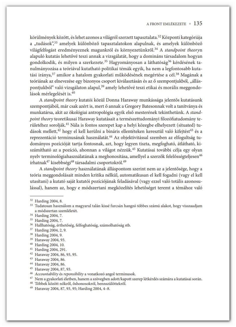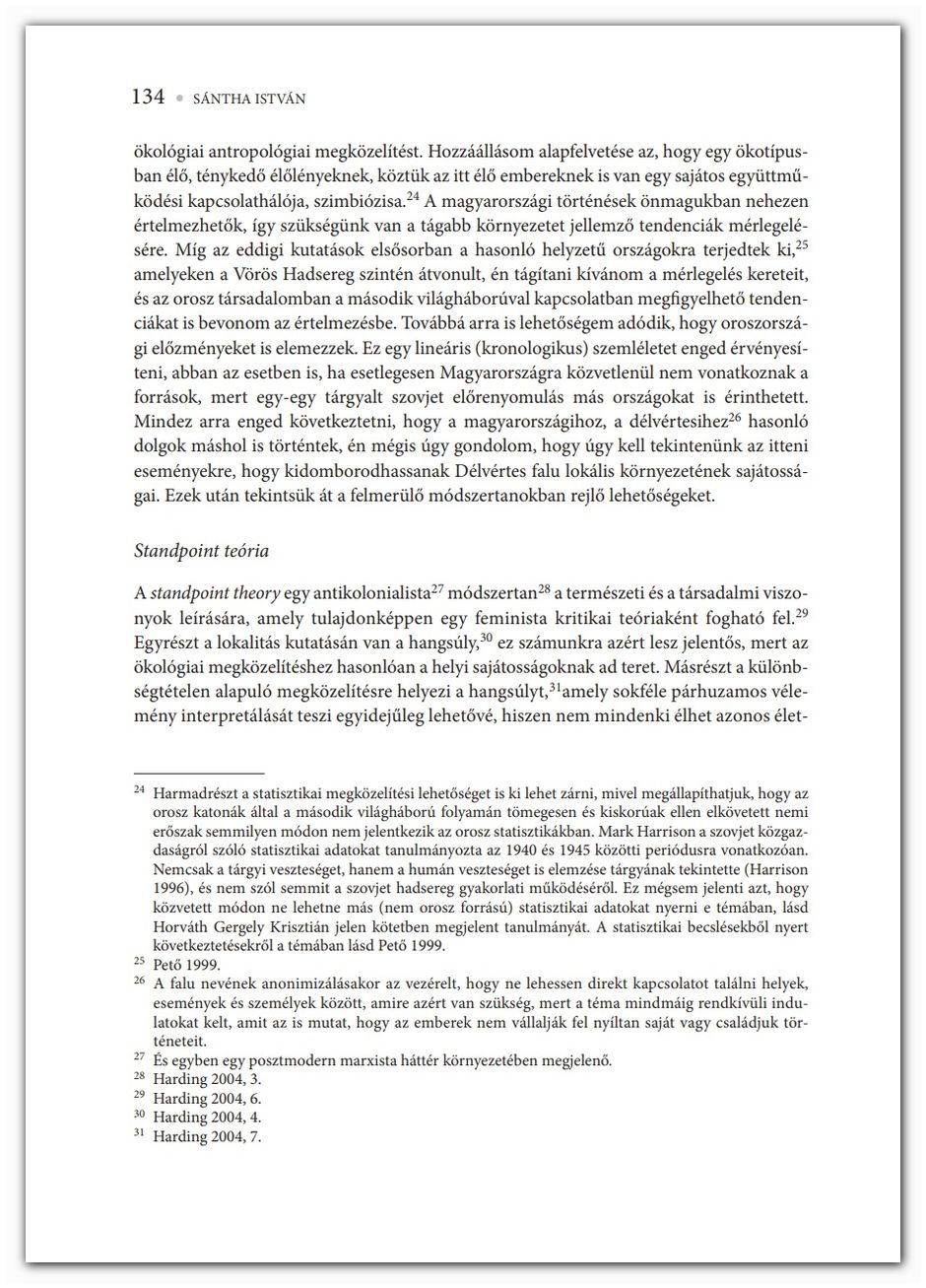 L’Harmattan, стр. 275–286. Во-вторых, я считаю, что проверенный в ходе моего исследования подход лучше всего можно сравнить с методом экологической антропологии. Я применил эколого-антропологический подход к интерпретации событий, связанных с сообществом, живущим в местной среде на протяжении веков. Основная предпосылка моего подхода состоит в том, что активные живые существа, населяющие экотип, в том числе и люди, имеют специфическую сеть кооперативных отношений и симбиоза.²⁴ События в Венгрии сами по себе трудно поддаются объяснению, их можно интерпретировать лишь с учётом тенденций, характеризующих более широкую среду. Хотя до сих пор исследования преимущественно охватывали страны с похожей ситуацией,²⁵ через которую прошла и Красная Армия, я стремлюсь расширить рамки анализа, включая в интерпретацию тенденции, наблюдаемые в российском обществе в связи с Второй мировой войной. Также у меня есть возможность анализировать историю России, что позволяет применять линейный (хронологический) подход даже в тех случаях, когда Венгрия напрямую не затрагивается, поскольку советское наступление влияло и на другие страны. Все это позволяет сделать вывод, что мой подход аналогичен исследованию венгерского Дель-Верте²⁶ и другим локальным сообществам. Тем не менее, я считаю важным рассмотреть особенности местной среды деревни Дель-Верте, чтобы выявить её уникальные характеристики. Далее следует обратить внимание на возможности, заложенные в новых методологиях. Теория точки зрения Теория точки зрения — это антиколониальная²⁷ методология²⁸ описания природных и социальных условий, которую можно понимать как форму феминистской критической теории.²⁹ С одной стороны, она уделяет основное внимание изучению локальности,³⁰ что важно для нас, поскольку, как и экологический подход, даёт пространство для учёта местных особенностей. С другой стороны, теория подчёркивает подход, основанный на дифференциации,³¹ который позволяет интерпретировать множество параллельных точек зрения, учитывая, что не все люди живут одинаковой жизнью. Например, изнасилования несовершеннолетних не отражаются в российской статистике. ²⁴ Во-вторых, можно исключить и статистический