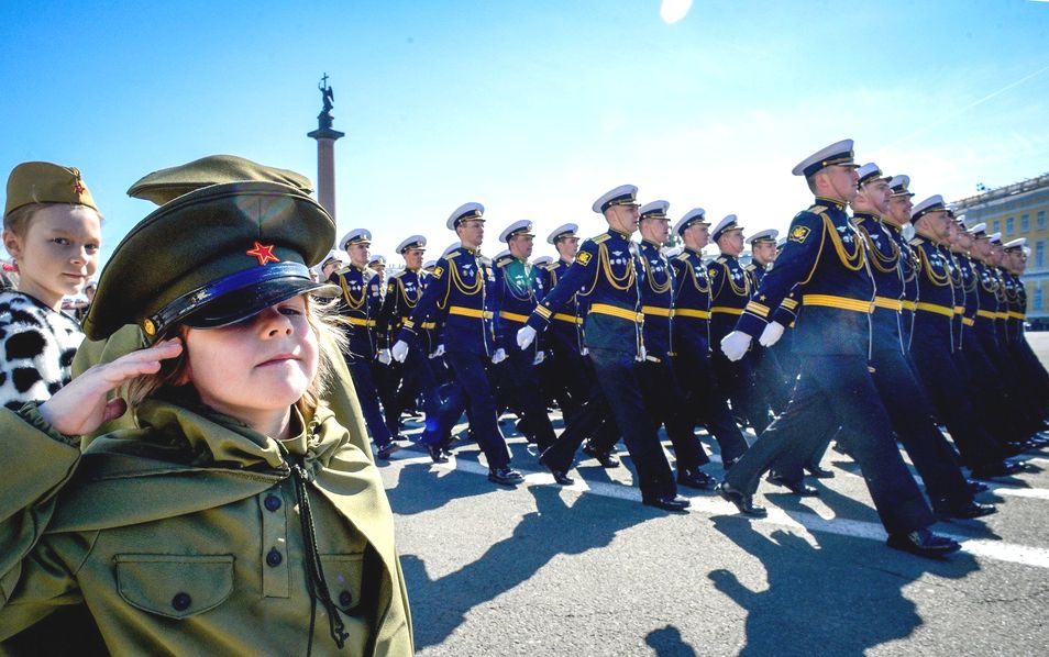 | Российские курсанты во время шествия «Бессмертный полк», посвященного празднованию победы союзников над нацистской Германией во Второй мировой войне, в центре Санкт-Петербурга, 2016 год. (Источник: Nic Markoff via Getty Images) | ||