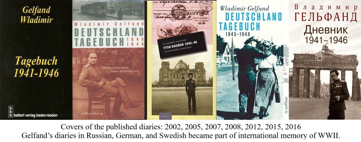 ![]() Обложки изданий дневника: 2002, 2005, 2007, 2008, 2012, 2015, 2016 гг. Дневники Владимира Гельфанда на русском, немецком и шведском языках — стали частью международной памяти о Второй мировой войне. Фото © www.gelfand.de |