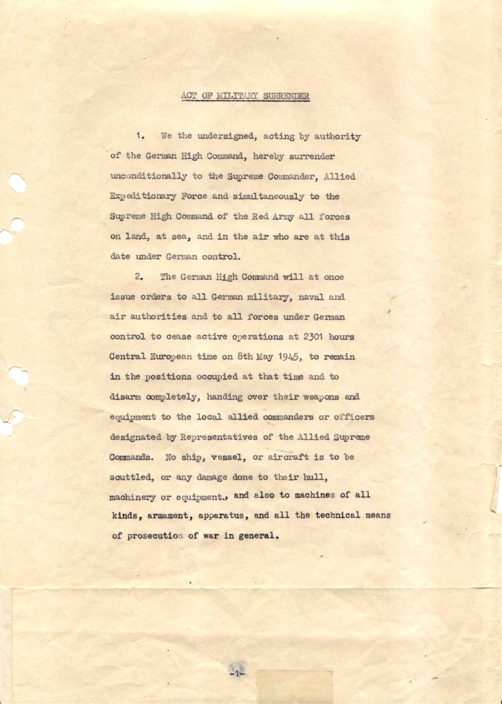 | Kapitulationsurkunde In Karlshorst wurden Exemplare in englischer, russischer und deutscher Sprache unterzeichnet. Bundesarchiv-Militärarchiv, Freiburg i. Br. |