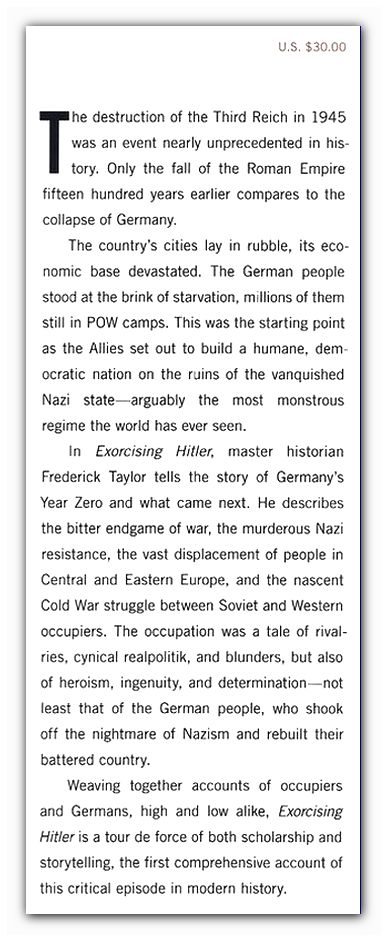 Об авторе:Фредерик Тейлор изучал историю и литературу в Оксфорде и Мюнхене. Даже во времена холодной войны интимные отношения с обеими Германиями ему знакомы, он был издателем и автором нескольких романов с театром Германии и связан с опубликованными в английском издании дневников Геббельса.Kрaткое описание: Крах Третьего рейха в 1945 году. Только падение Римской империи полторы тысячи лет раньше можно сравнить с разрушением Германии. Страна лежала в руинах, ее экономическая база разрушена. Немецкий народ стоял на грани голодной смерти, миллионы из них до сих пор в лагерях для военнопленных. Это была отправная точка, как союзники намеревались строить гуманное, демократическое государство на руинах побежденной нацистской государственной, возможно, самым чудовищным режимом когда-либо видел мир. Мастер-историк Фредерик Тейлор рассказывает историю Year Zero Германии, и что будет дальше. Он описывает горькую эндшпиль войны, убийственное сопротивление нацистов, огромные перемещения населения в Центральной и Восточной Европе, и зарождающейся холодной войне между советскими и западными оккупантами. Сводя воедино рассказы об оккупантах и немцах, как изгнанных, так и низших, Экзорцизирующий Гитлер является движущей силой как учености, так и рассказывания историй, первого всестороннего описания этого критического эпизода в современной истории. /Нем./ После распада Римской империи, по крайней мере, в Европе не было параллели, такой, как, по крайней мере, в Европе с кончиной Германии в 1945 году. После всего лишь 12 лет нацистского правления страна лежала в руинах: разрушенные города, разрушенная промышленность, несохраненное культурное наследие. |